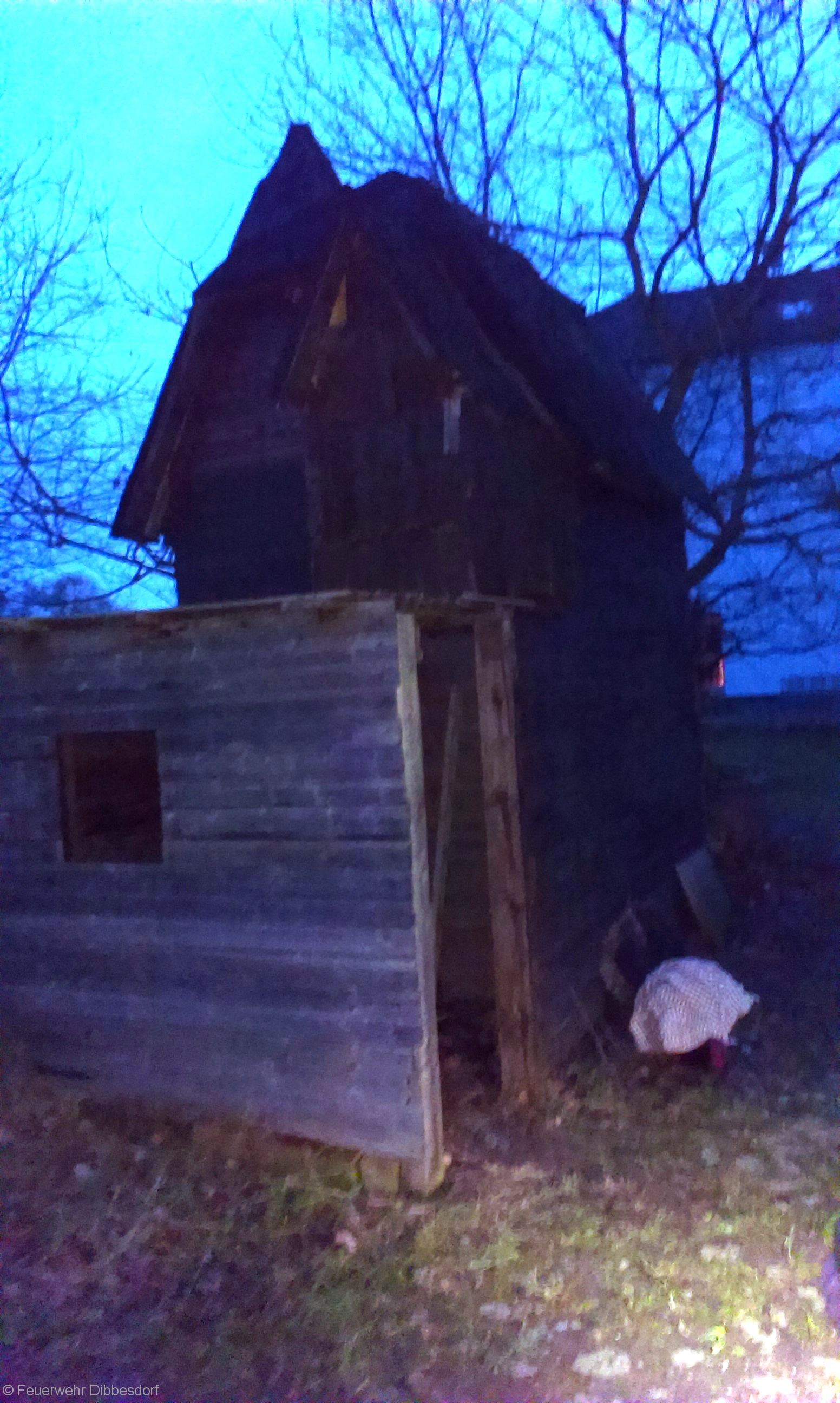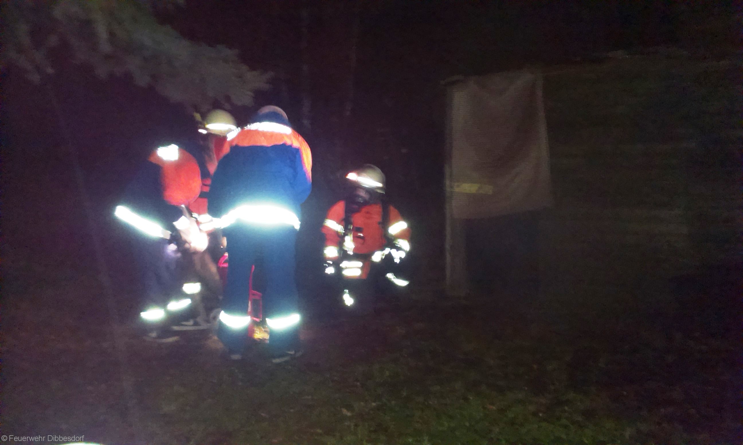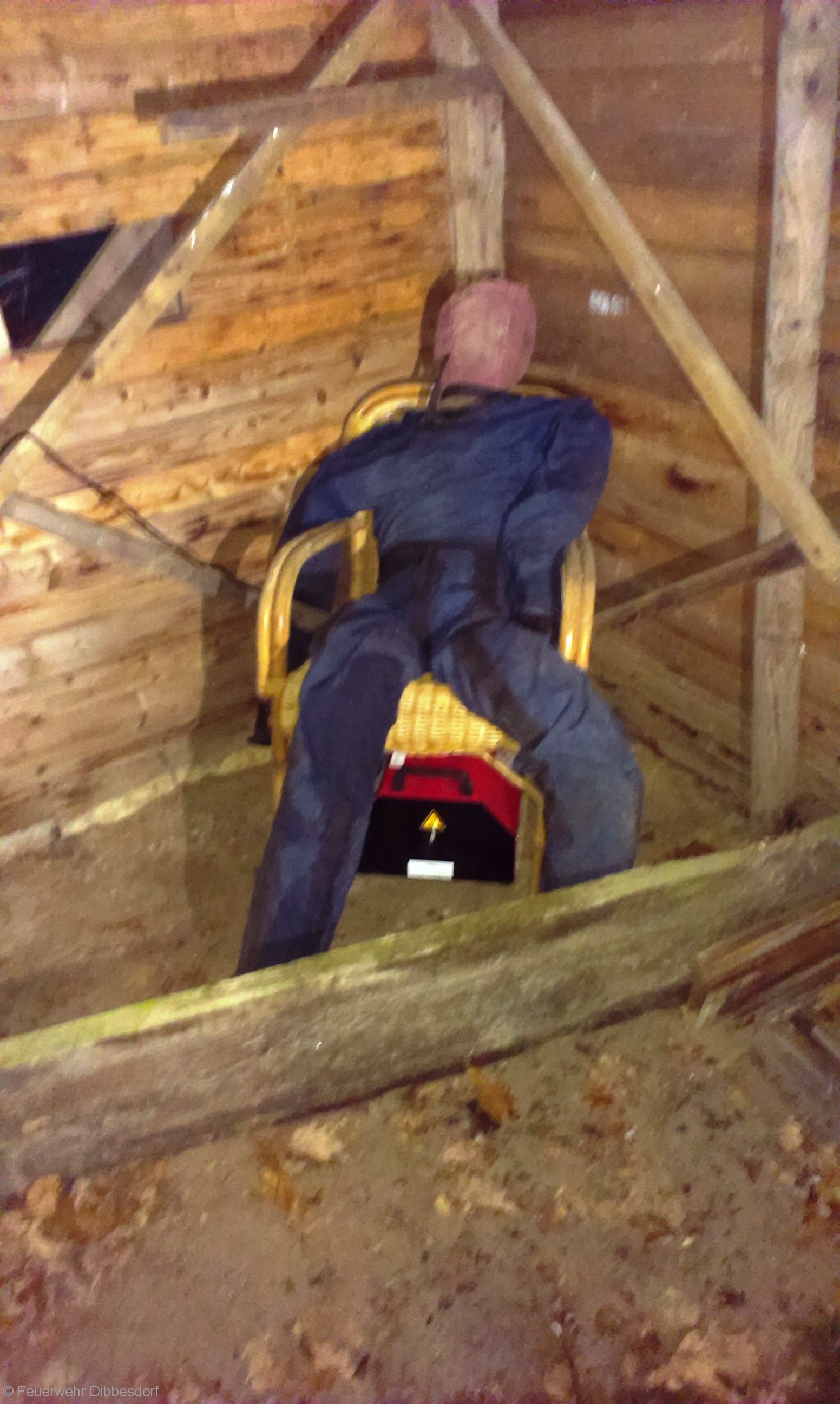 Der Rauch ist nur Diskonebel aus einer Nebelmaschine, in dem Gartenhaus liegen zwei Dummys, der Unfall mit dem Angriffstrupp ist nur gespielt….