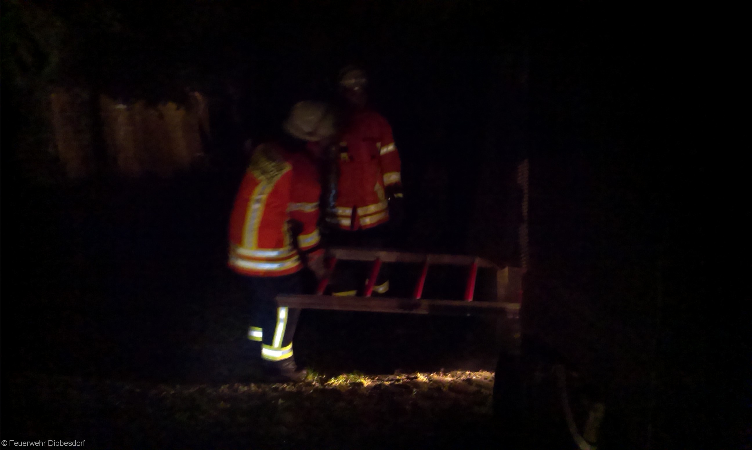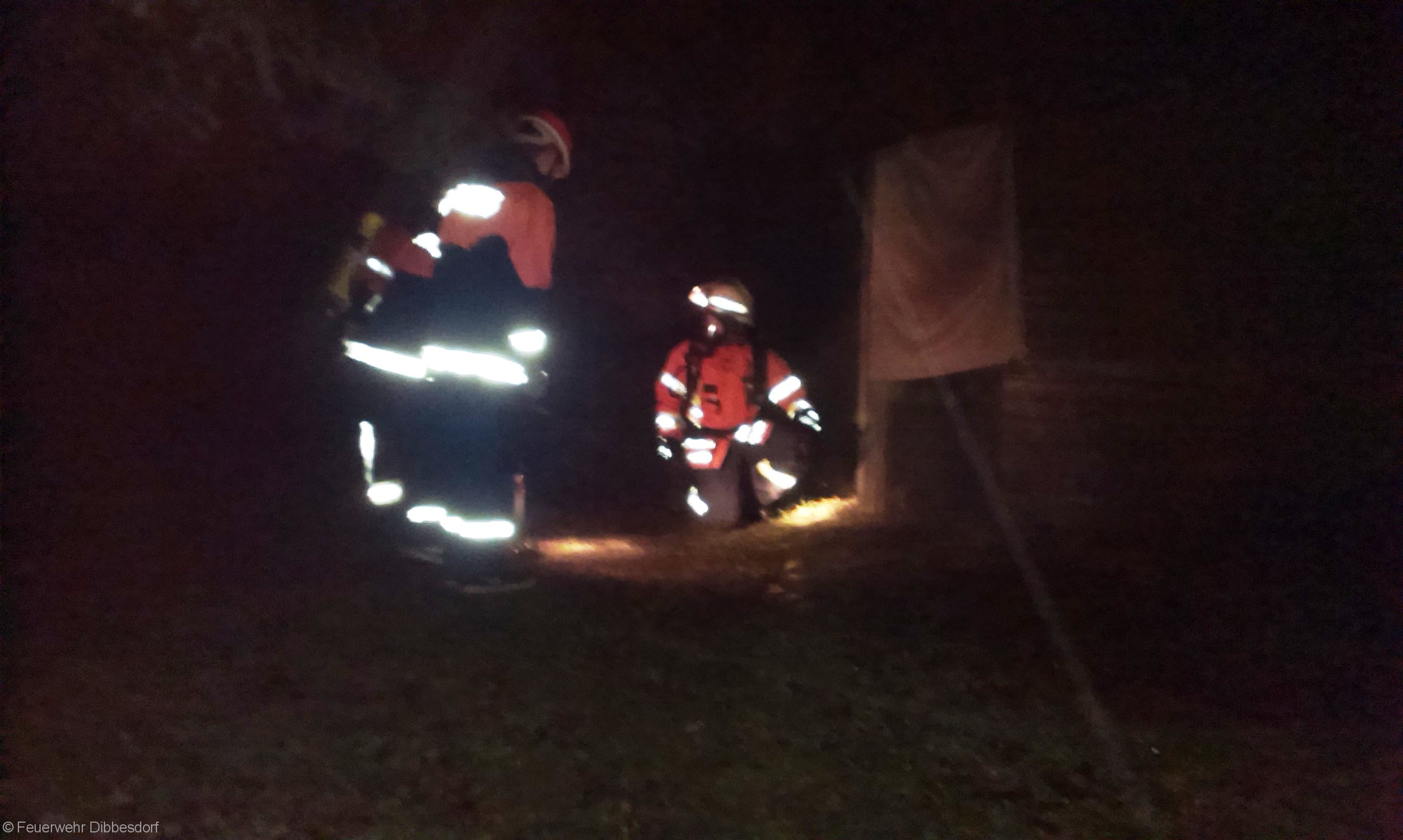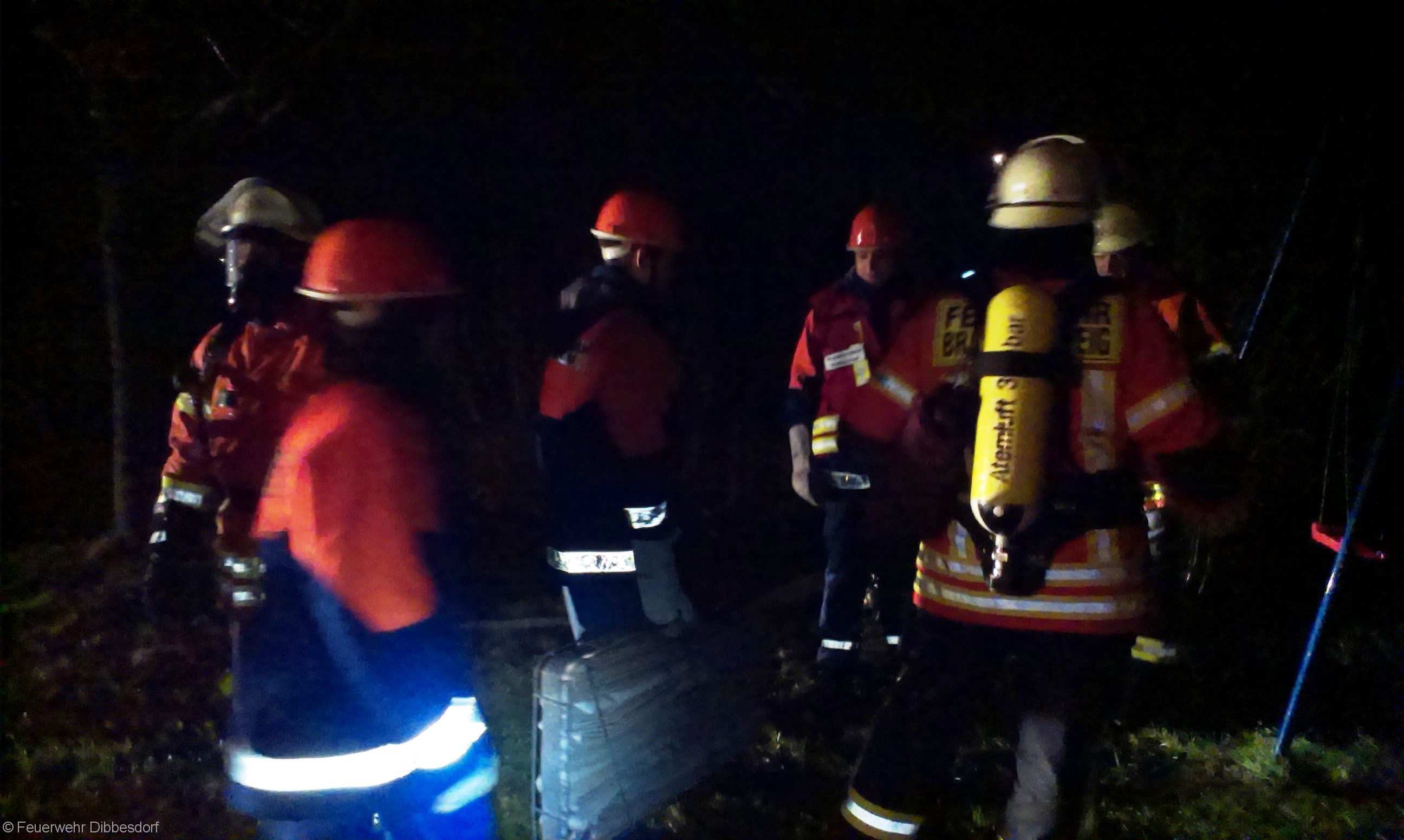 Der Rauch ist nur Diskonebel aus einer Nebelmaschine, in dem Gartenhaus liegen zwei Dummys, der Unfall mit dem Angriffstrupp ist nur gespielt….