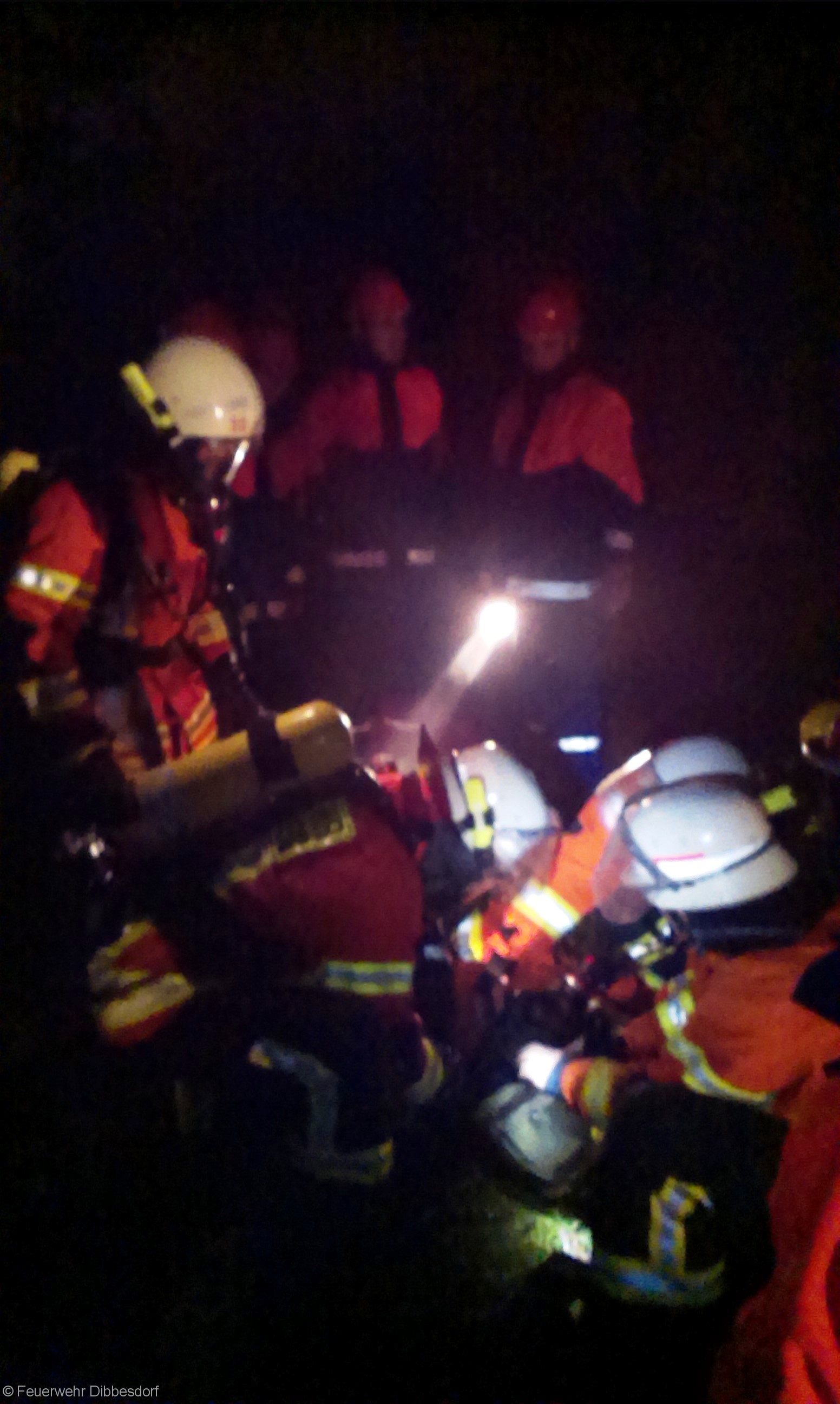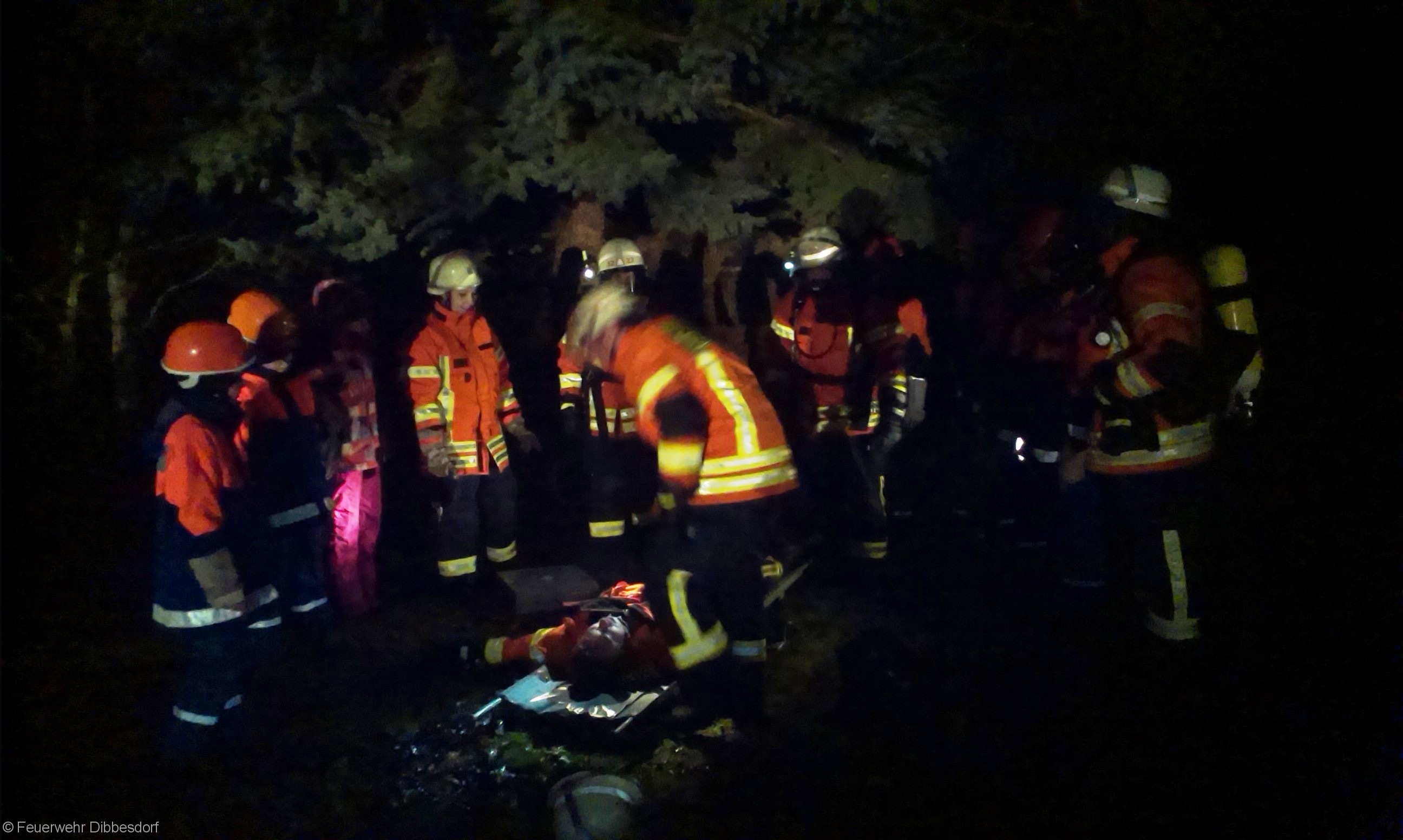 Schnell wird der verunglückte Trupp gefunden, der verletzte nach draußen gebracht, wo bereits eine Trage sowie Personal auf ihn wartet. Ein Arzt und ein Rettungssanitäter der Ortswehr lagern den Truppführer, nehmen ihm außerhalb des Gefahrenbereichs Helm, Maske und PA Gerät ab, checken seine Vitalparameter und machen einen Bodycheck. Er ist wohlauf….