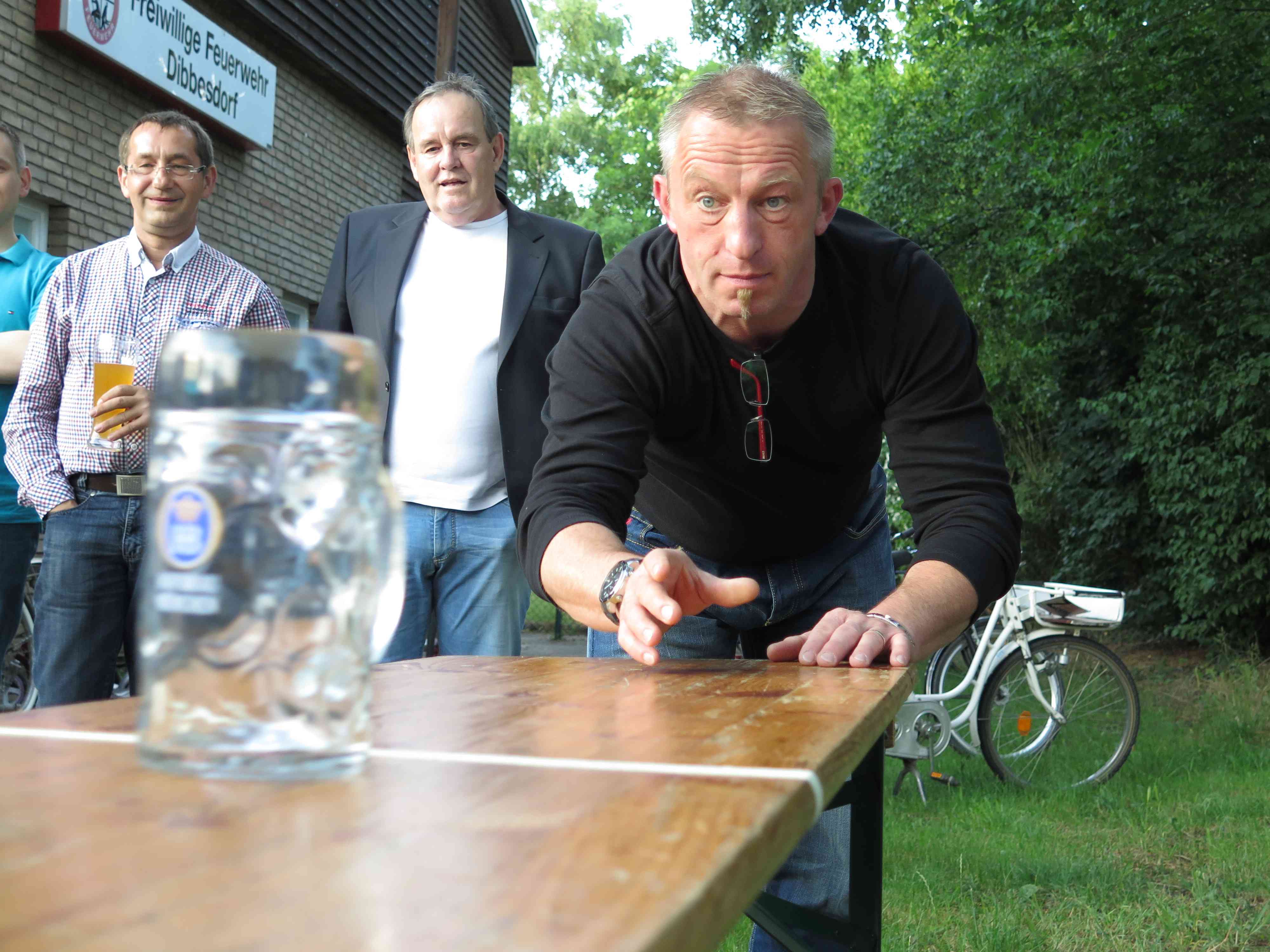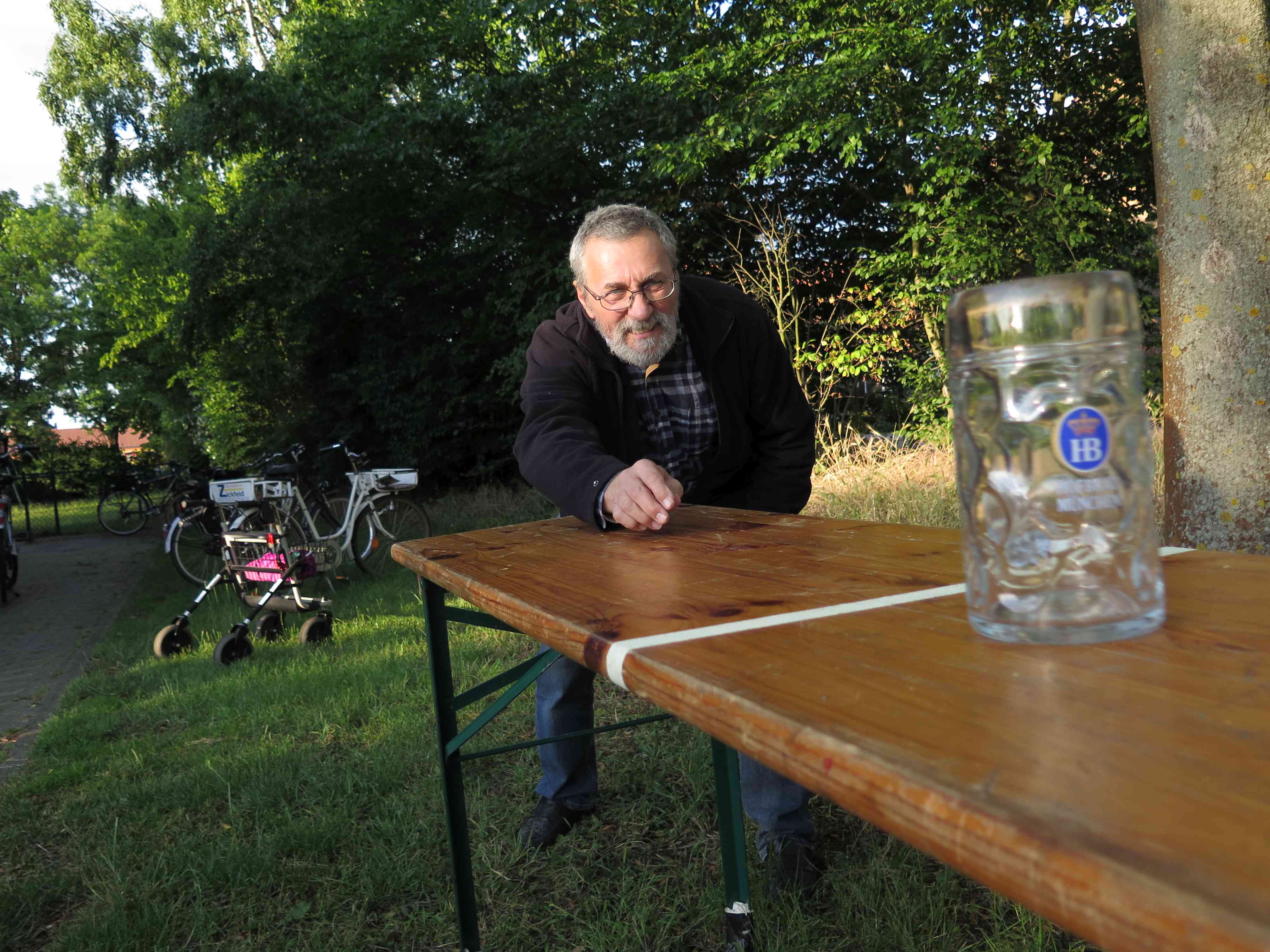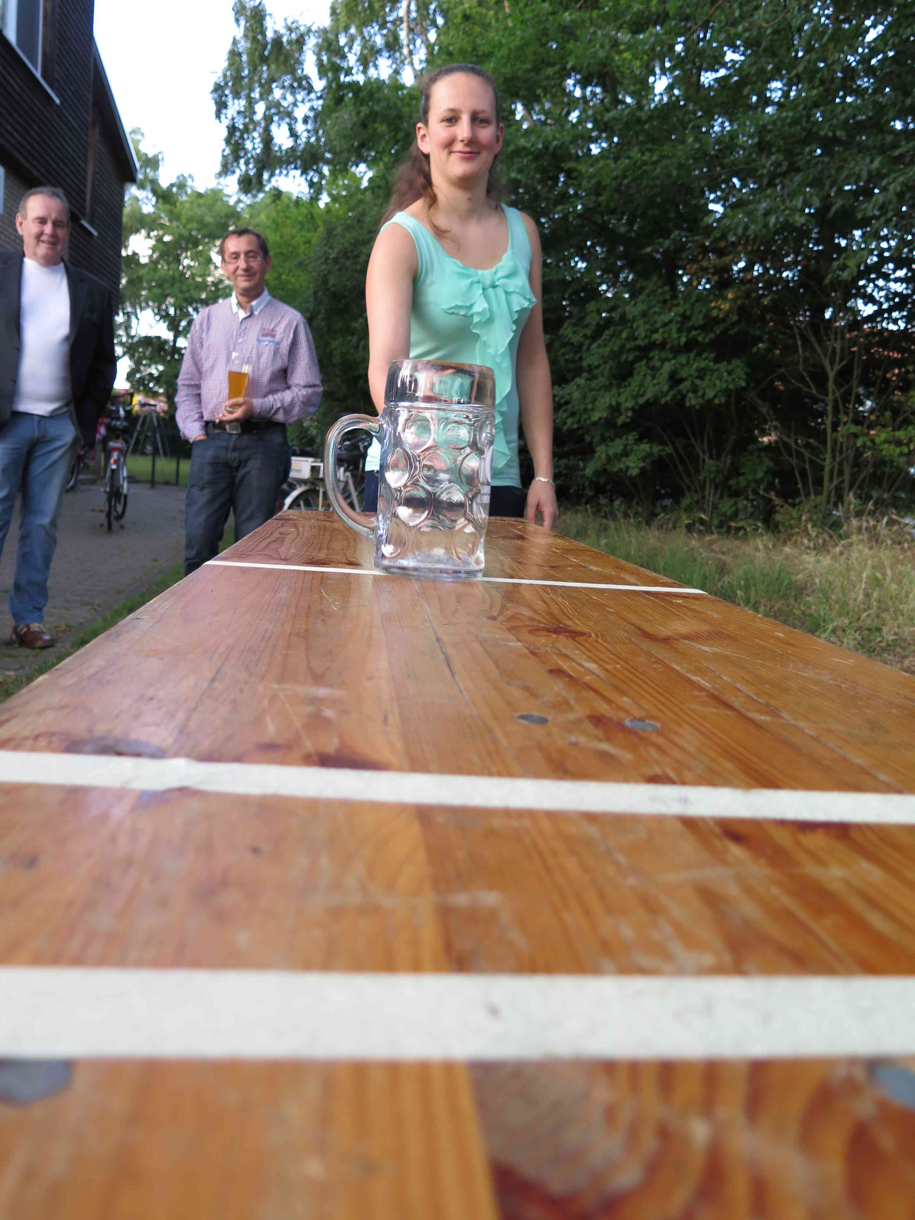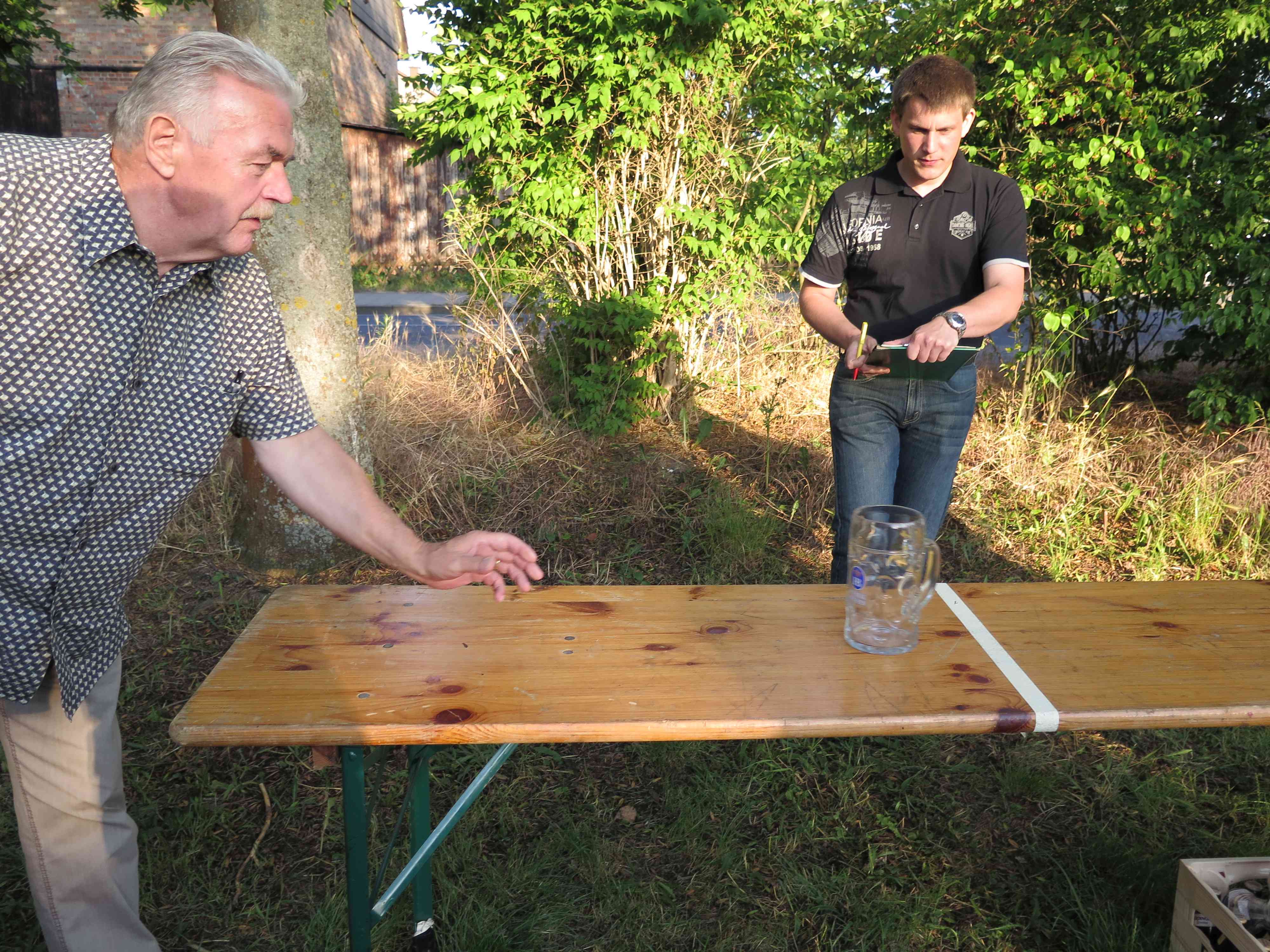 Hierbei galt es dem Maßkrug über einen Tisch so viel Schwung zu geben, das dieser am Ende des Tisches erst zum Stillstand kam und nicht hinten runter fiel.