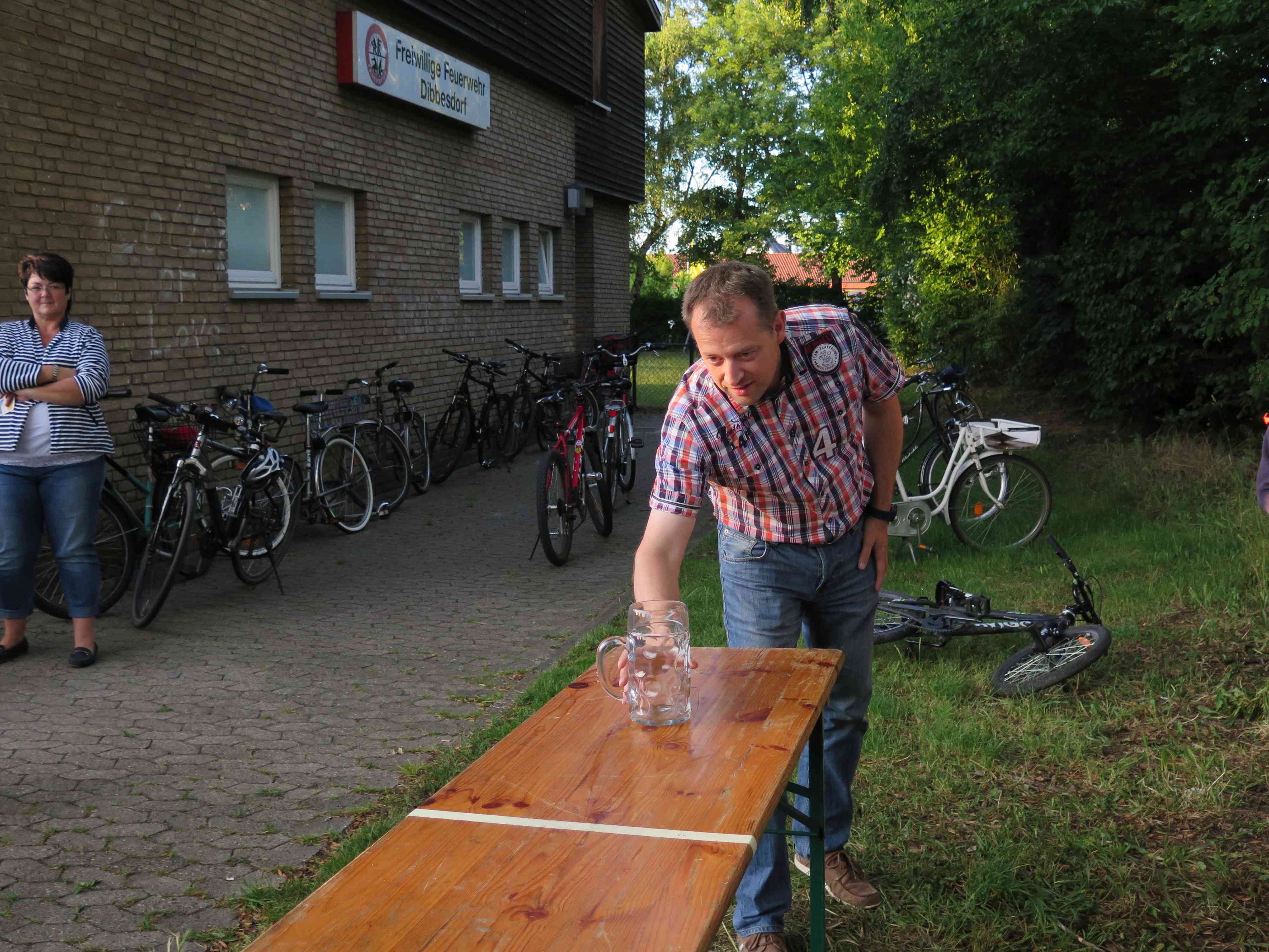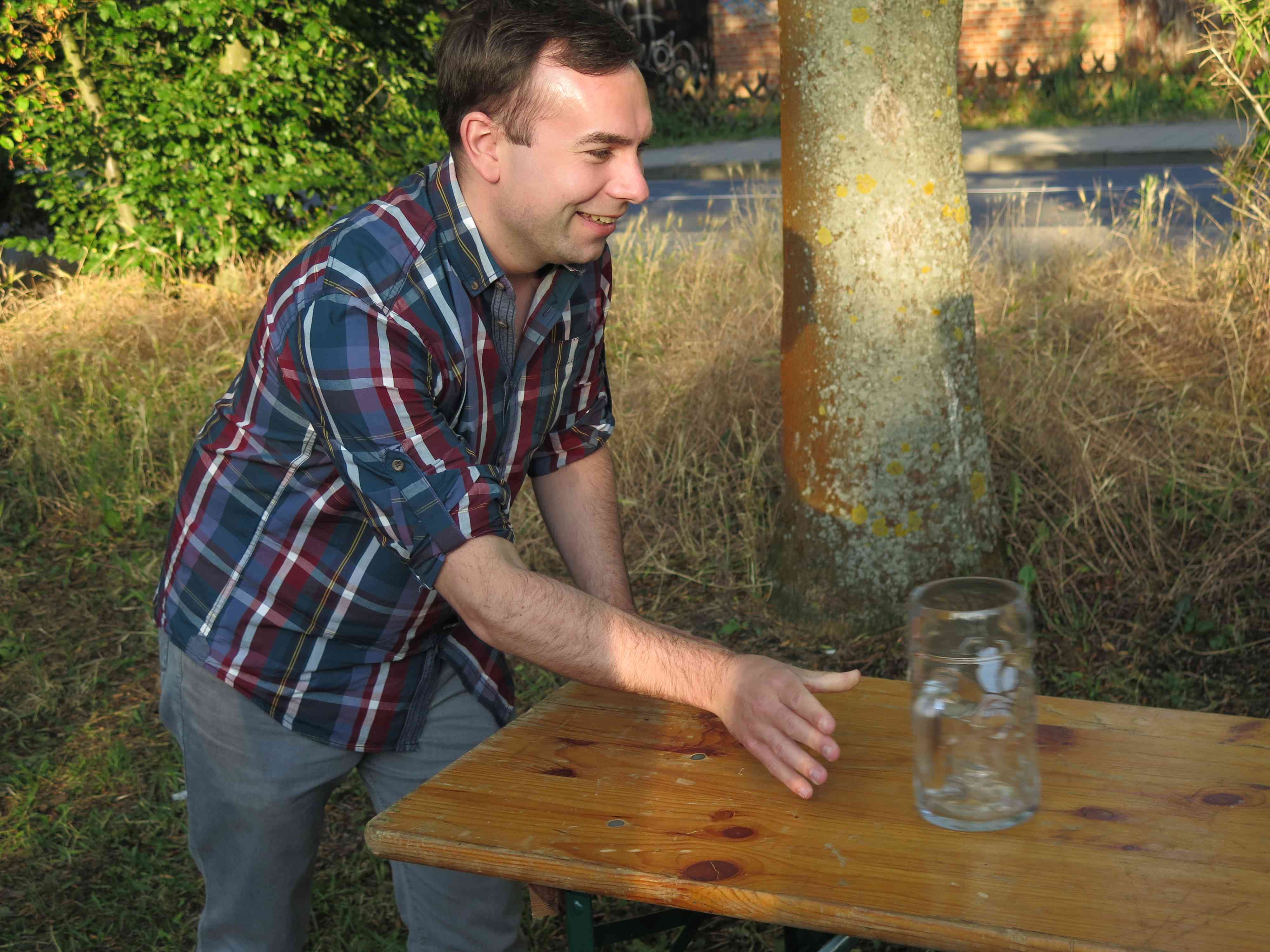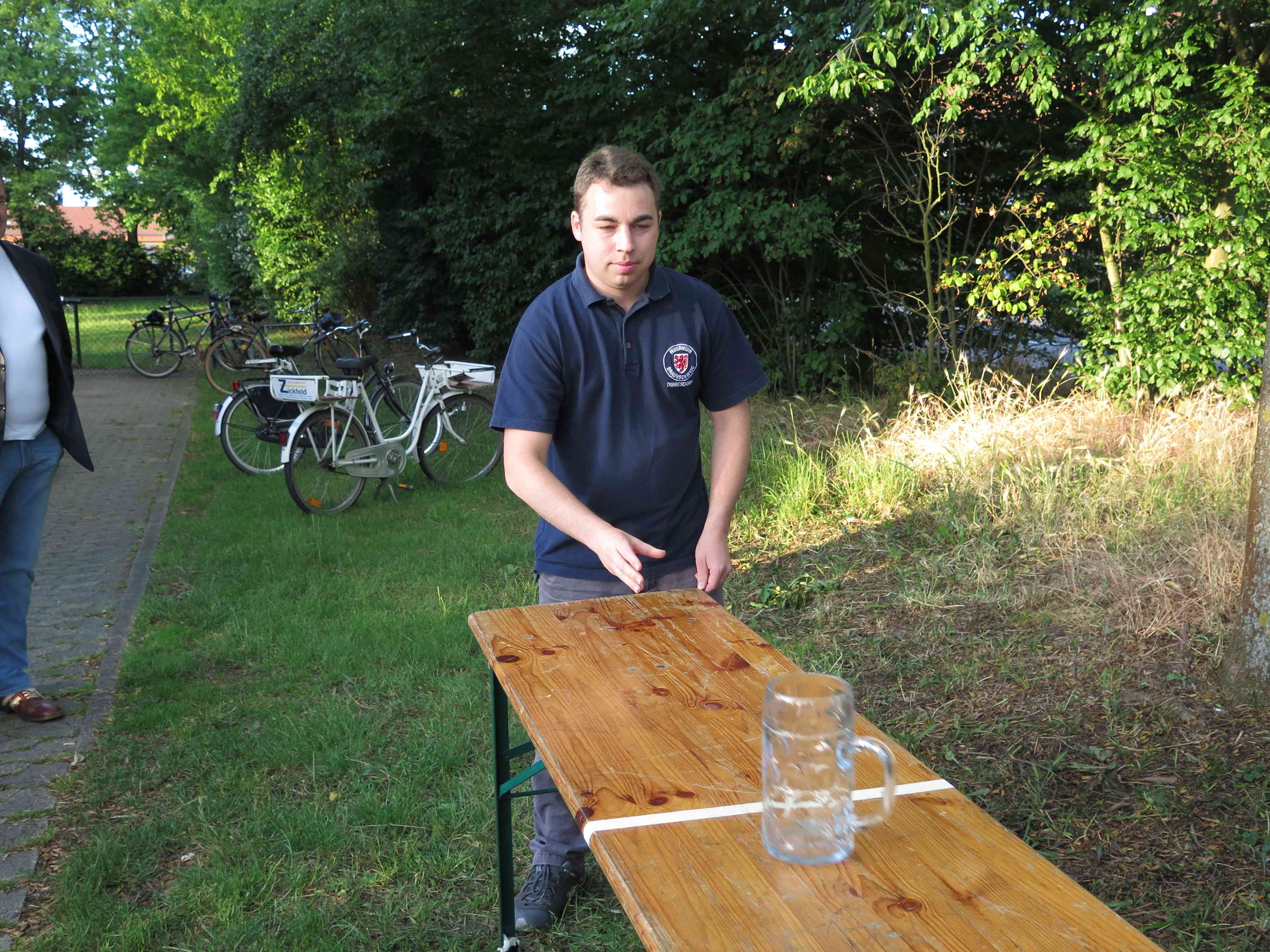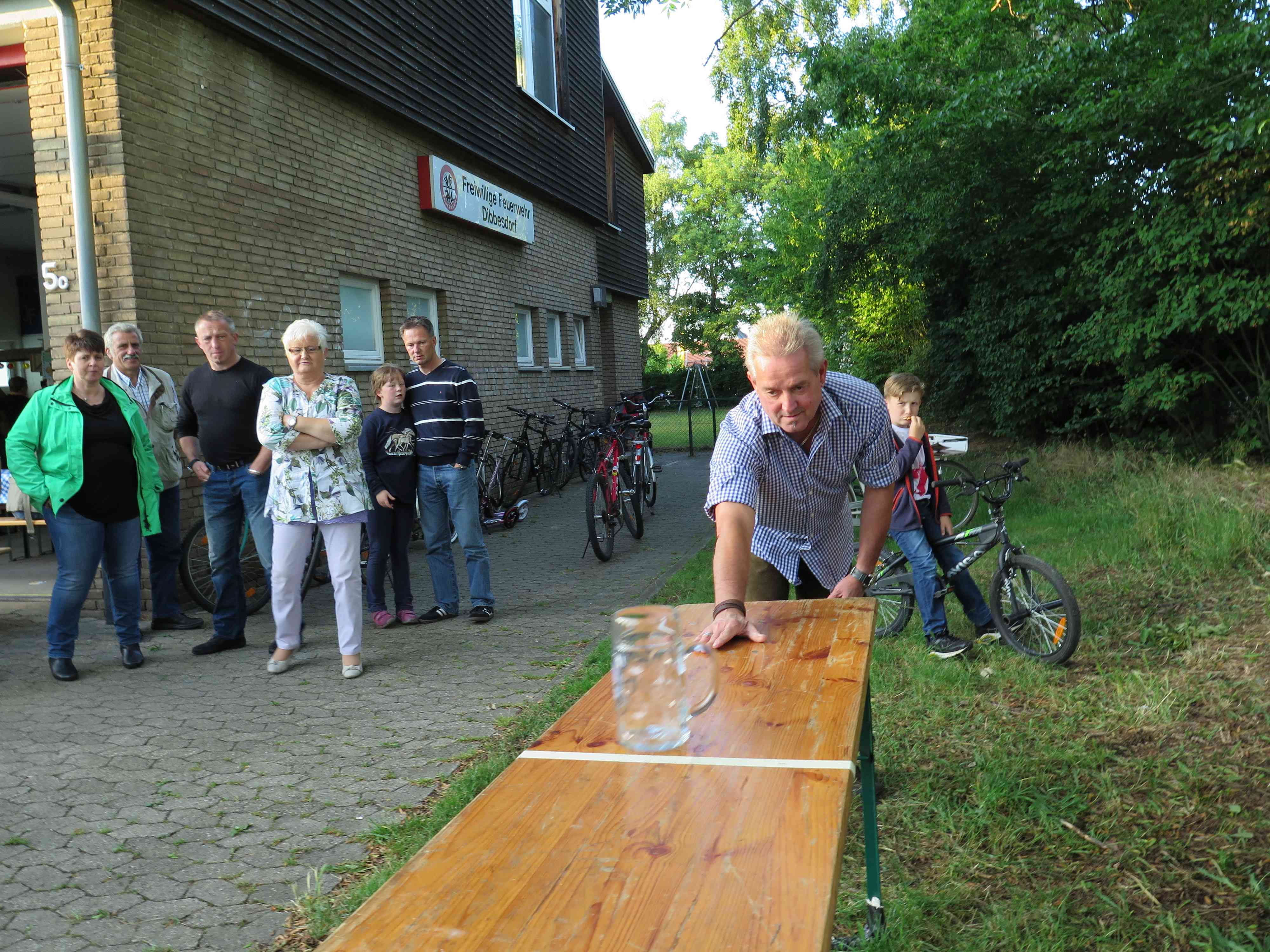 Hierbei galt es dem Maßkrug über einen Tisch so viel Schwung zu geben, das dieser am Ende des Tisches erst zum Stillstand kam und nicht hinten runter fiel.